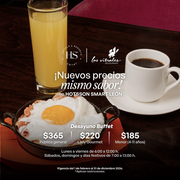 Disfrute nuestro desayuno buffet en Restaurante Los Vitrales. Lady Gourmet $220, público general $365 y menor $185, IVA incluido.|Lunes a viernes de 6:00 a 12:00 h y sábados, domingos y festivos de 7:00 a 13:00 hr.|Vigencia 2026.