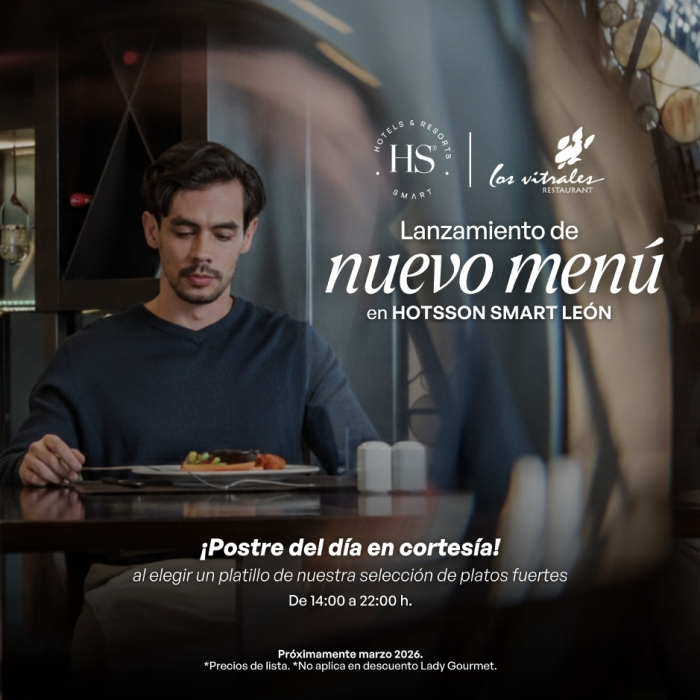 Lanzamiento de nuevo menú en Restaurante Los Vitrales. Elija un platillo de nuestra selección de platos fuertes y disfrute el postre del día en cortesía.|Horario de 14:00 a 22:00 h.|Precio de lista.|Próximamente marzo 2026.