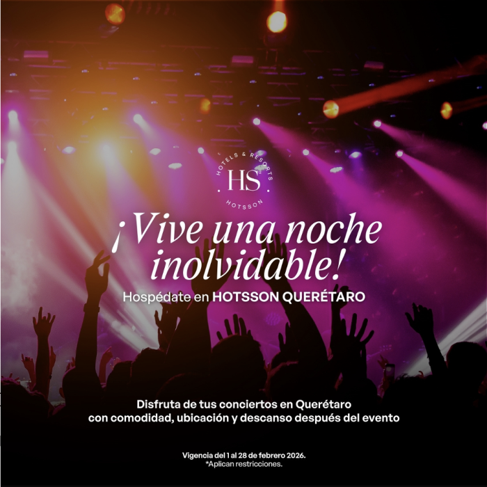 Cartelera de eventos febrero. Viva una noche inolvidable y hospédese en HOTSSON Querétaro. Ideal para quienes asisten a conciertos en la ciudad. Reserve directo y asegure su estancia.|Vigencia del 1 al 28 de febrero de 2026.