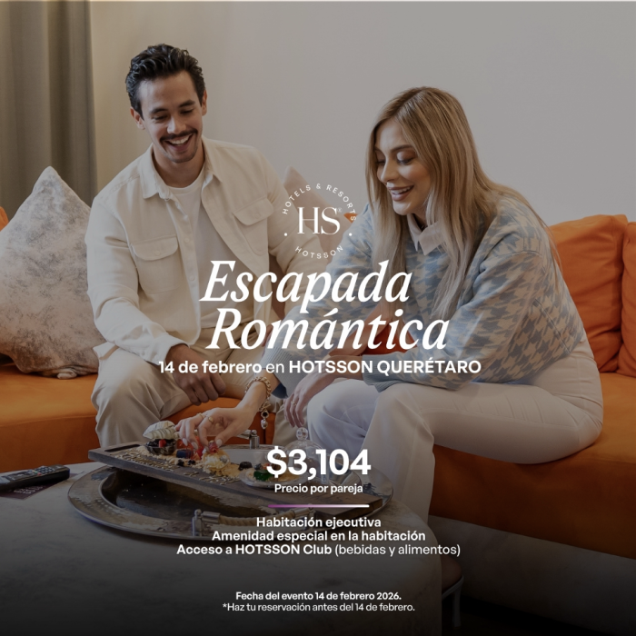 Escapada romántica en HOTSSON Querétaro este 14 de febrero. Incluye habitación ejecutiva, amenidad especial y acceso a HOTSSON Club con alimentos y bebidas.|Precio $3,104.15 impuestos incluidos.|Reserva directa antes del 14 de febrero y ase