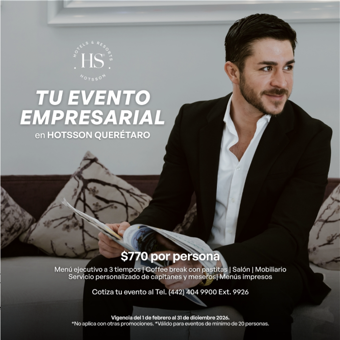 Tu evento empresarial en HOTSSON Querétaro. Paquete integral para reuniones exitosas por $770 por persona, IVA incluido|Incluye menú ejecutivo de 3 tiempos, coffee break, salón, mobiliario, servicio personalizado y menús impresos.|Vigencia
